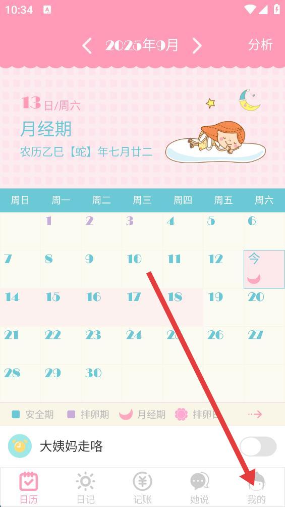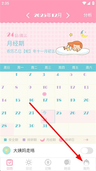 1、打开女生日历APP,点击底部导航栏我的,进入个人页面。