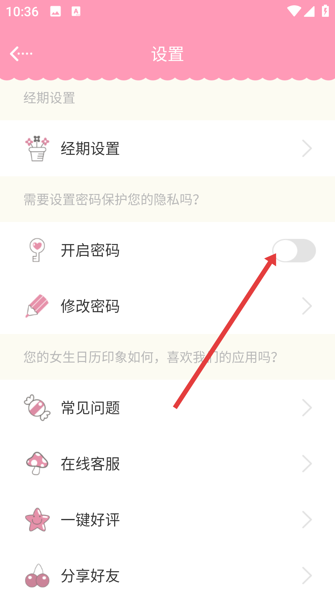 3、在设置界面中,找到开启密码选项,点击其右侧开关将其打开。
