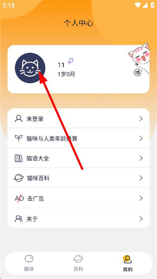 1、打开猫语翻译器app,点击我的页面中的宠物头像区域。
