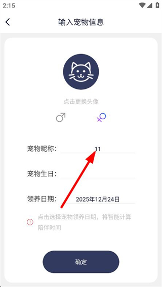 2、进入输入宠物信息页面后,在昵称输入框中填写新名字。
