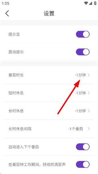 2、在设置页面中,找到并点击上方的番茄时长选项。