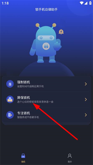 1、打开锁手机自律助手app,在主页面点击屏保锁机选项。