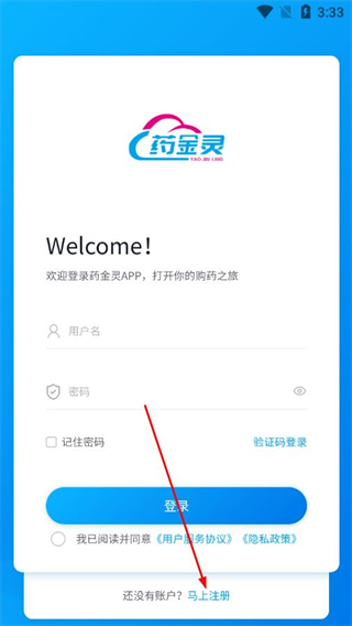 1、打开药金灵APP,在登录页面点击马上注册选项。