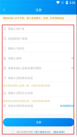 3、填写用户名、手机号、密码等注册信息,勾选同意协议后点击注册。