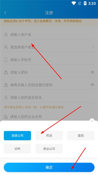 2、进入注册页面后,点击请选择用户类型,在弹出选项中选择对应类型,点击确定。