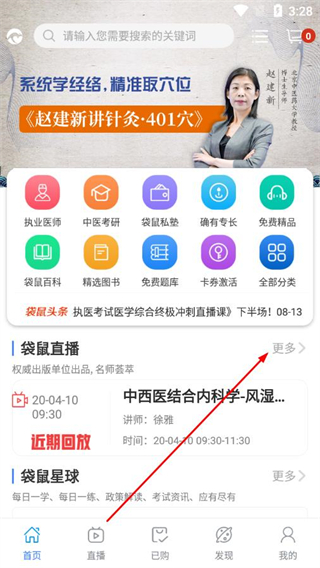 1、打开袋鼠医学APP,在首页的袋鼠直播板块点击更多按钮。