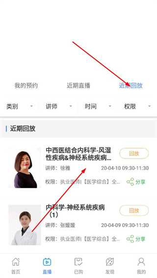 2、进入直播页面后,切换到近期回放标签,选择目标直播课程。