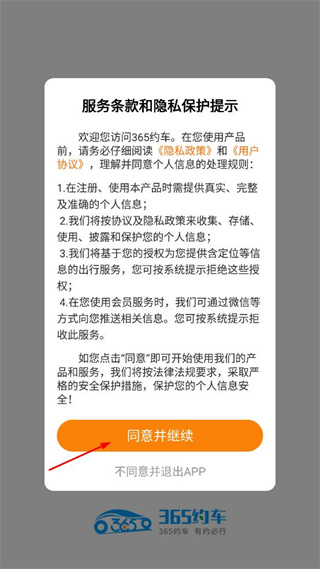 1、打开365约车,查看服务条款和隐私保护提示,点击同意并继续按钮进入主页面。