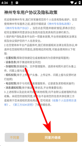 1、打开神州专车,在页面点击同意并继续,进入应用主界面。