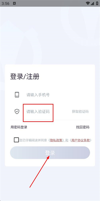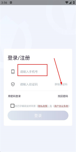 2、在登录页面填写手机号,勾选协议后,点击获取验证码。