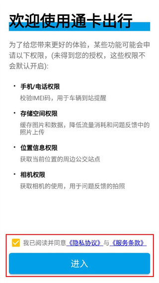1、打开通卡出行APP,勾选已阅读并同意隐私协议与服务条款的选项,点击进入按钮。