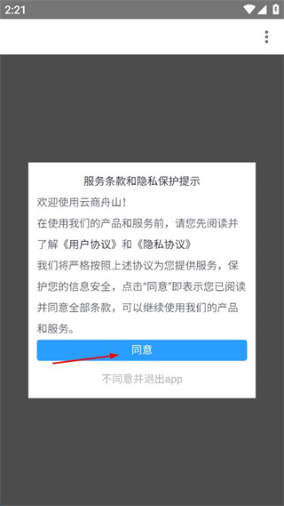 1、打开查看弹出的服务条款和隐私保护提示,点击同意按钮进入应用。