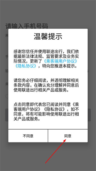 1、打开联途出行APP,查看弹出的温馨提示内容,点击界面中的同意按钮进入应用。