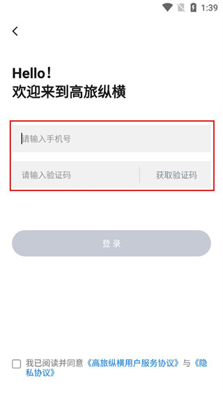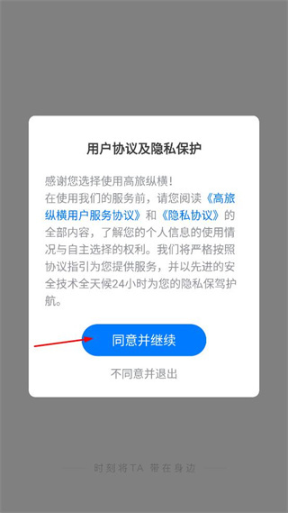 1、打开高旅纵横APP,查看弹出的用户协议及隐私保护提示,点击同意并继续按钮进入应用。