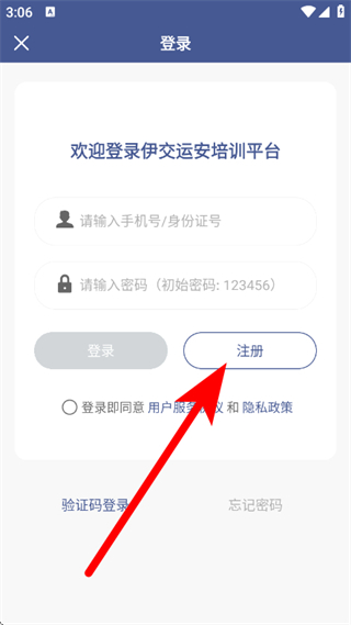 2、在登录页面,点击注册选项,进入验证手机号页面。