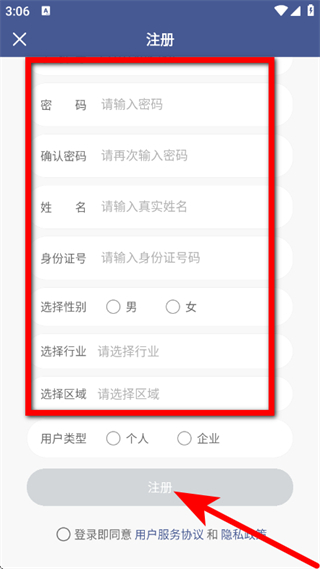 4、在注册页面,输入密码、身份证号码等信息,点击注册,完成账号注册。