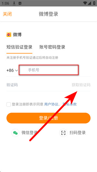 3、在短信验证登录界面的手机号框中填写手机号,然后点击获取验证码获取短信验证码。