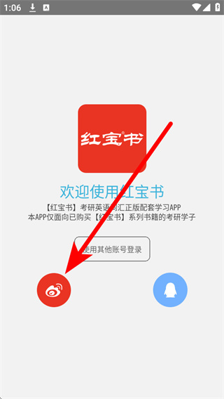 1、打开红宝书词汇,在欢迎界面点击微博登录,进入微博登录页面。