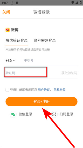 4、将收到的验证码填入验证码框,勾选协议后,点击登录注册完成账号登录。