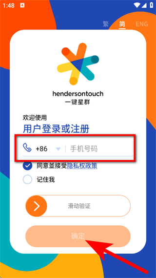 2、在用户登录或注册页面,输入手机号码,点击确定,进入验证码输入页面。