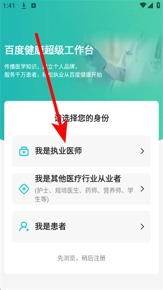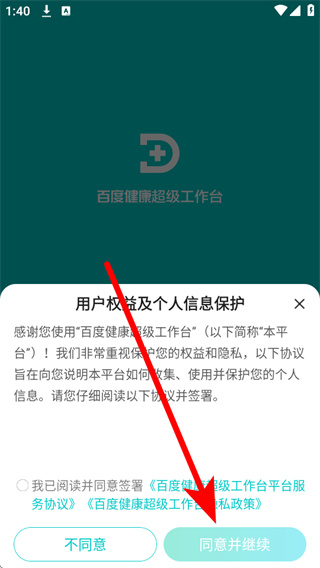 1、打开百度健康超级工作台,勾选相关协议,点击同意并继续,进入身份选择界面。