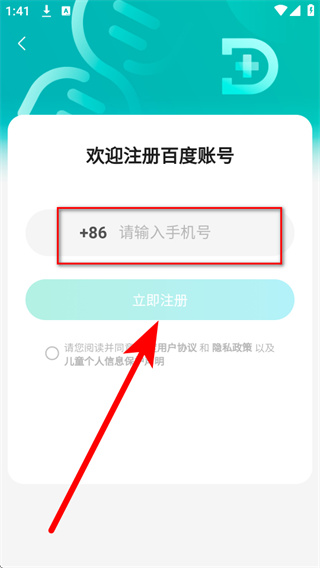 4、在注册界面的手机号框中填写手机号,勾选相关协议后点击立即注册,按提示完成验证,完成医生身份的认证。