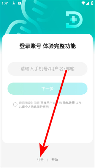 3、在登录账号体验完整功能页面,点击下方的注册,进入百度账号注册界面。
