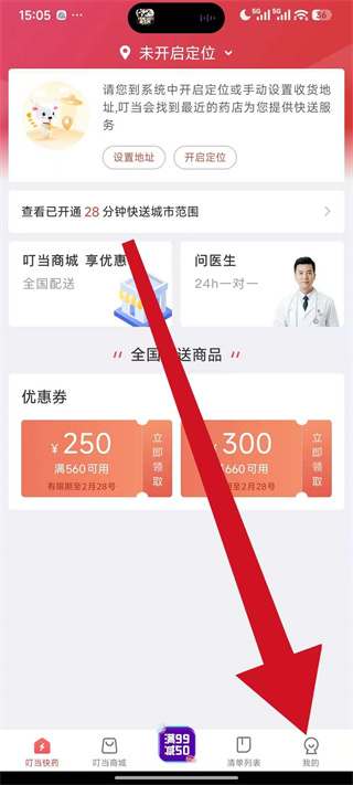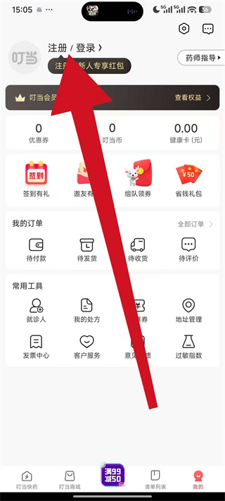 1、打开叮当快药,点击底部导航栏的我的,进入个人中心页面。