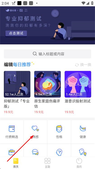 1、打开口袋心理测试APP,在首页点击情感分类。