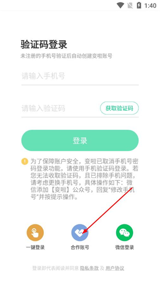 2、若选择合作账号登录,点击页面中的合作账号选项。