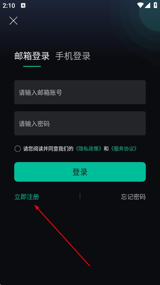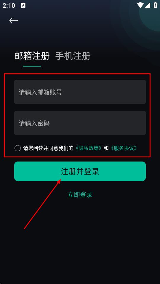 4、进入注册页面,选择注册方式,输入对应的账号、设置密码,勾选同意隐私政策和服务协议,点击注册并登录,即可完成账号注册。