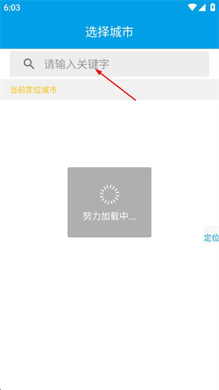 3、进入选择城市页面,找到顶部的搜索框,点击该搜索框准备输入对应的城市关键字。
