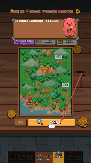 1、在地图界面选择区域,点击进入关卡,开启该区域的探索挑战。