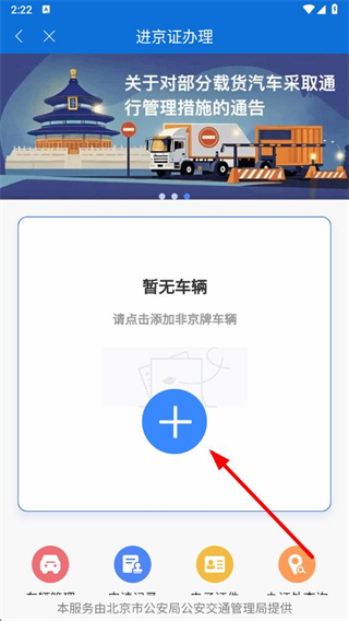 2、在进京证办理页面,点击蓝色加号图标添加非京牌车辆。