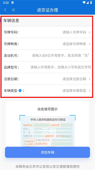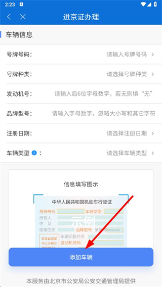 4、填写完成后,点击添加车辆按钮,按照提示完成进京通行证办理操作。