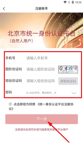 4、在注册页面,依次输入手机号、验证码、设置密码,勾选协议后点击下一步,按流程完成账号注册。