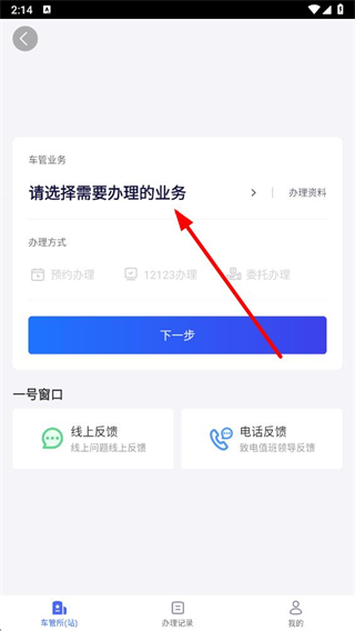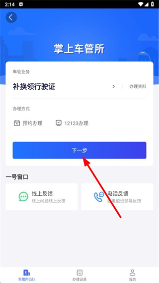 4、选择后点击下一步按钮,按照提示完成补领行驶证的预约操作。