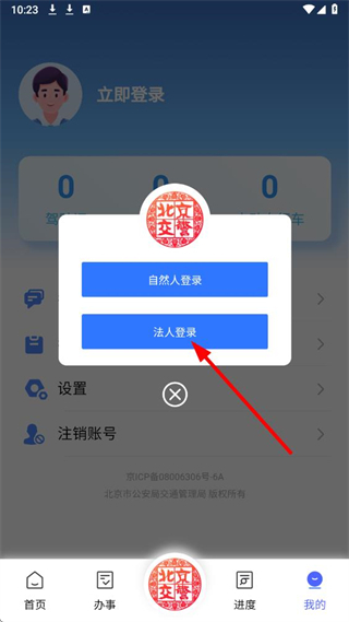 3、在登录类型菜单中,点击法人登录选项,进入法人账号的登录验证页面。