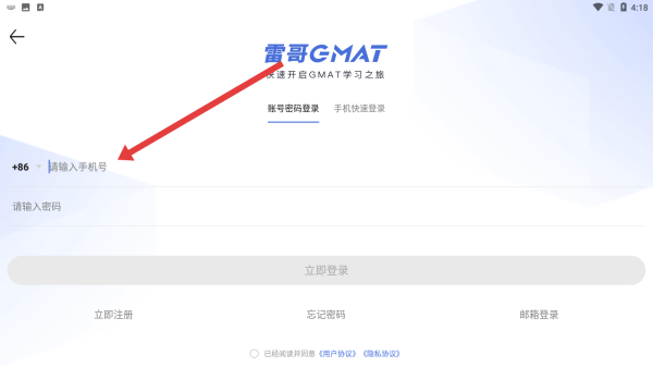 3、在雷哥GMAT登录页面中,点击输入框依次填写手机号和密码完成登录操作。