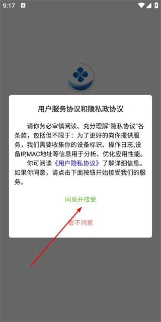 1、在使用协议隐私政策弹窗中点击同意并接受,进入登录页面。