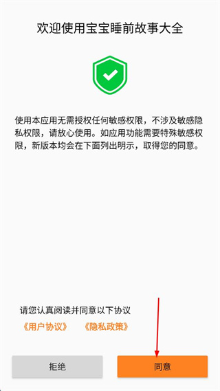 1、打开宝宝睡前故事大全APP,查看弹出的协议提示,点击同意按钮进入应用主界面。