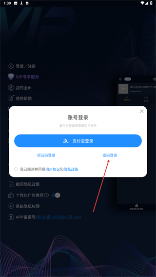 3、点击登录/注册后弹出账号登录窗口,在窗口中选择密码登录选项。