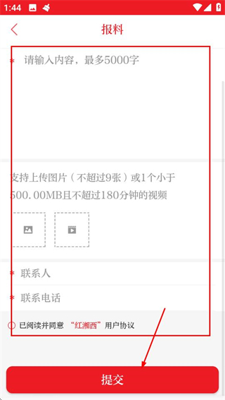 3、在报料页面,填写内容并勾选协议后,点击提交按钮即可完成报料。