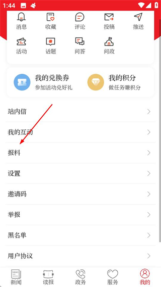 2、在个人中心页面,点击报料选项,可进入报料页面。