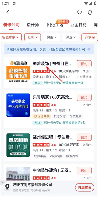 1、在装修平台首页点击装修公司选项,进入装修公司列表页面。