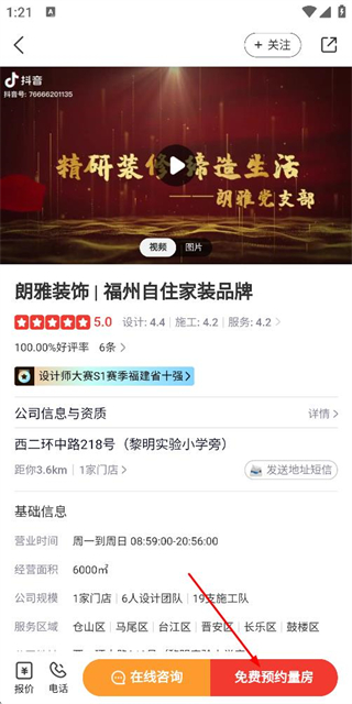 3、在公司详情页面点击预约量房按钮,发起装修服务的预约申请。