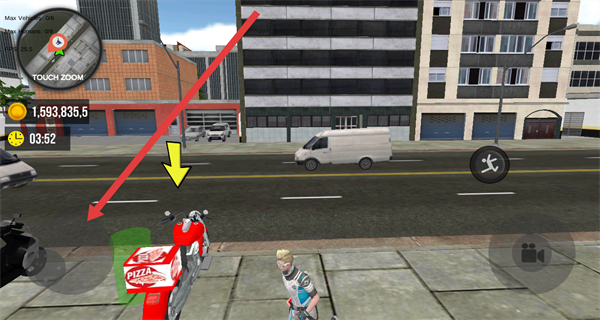 1、滑动陀螺仪操控角色移动,前往场景中的外卖摩托车位置,准备开启配送任务。