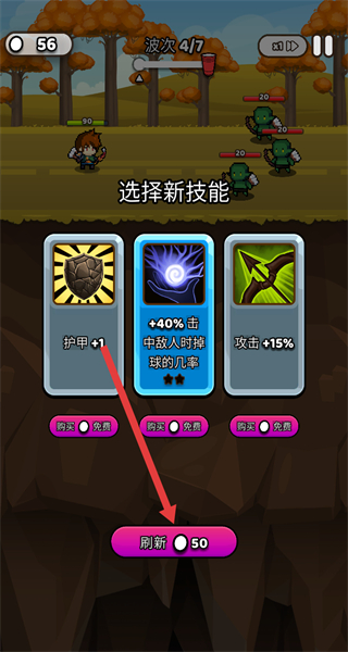 4、在技能选择界面,消耗小球点击刷新按钮,更换技能选项,挑选适配的技能,增强战斗能力。