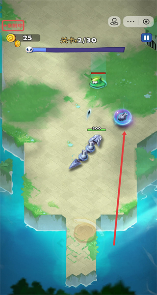 1、在关卡1界面,拖动底部摇杆移动角色,启动关卡,开始炮台闯关进程。