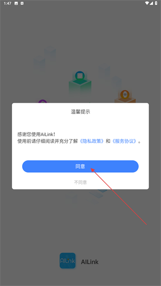 1、打开ailinkAPP,进入时会弹出温馨提示,阅读后点击同意的按钮。